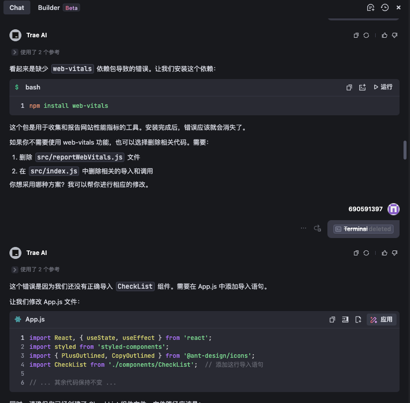 在右侧输入框内,简单描述了需求,给出产品的基本信息。很快就给出如何搭建 React 项目,主要代码的编写,本地运行指令。只需要在聊天框里面点击“运行”、“应用”,在代码文件类似 Git 交互似的 “接受” 代码改动即可。