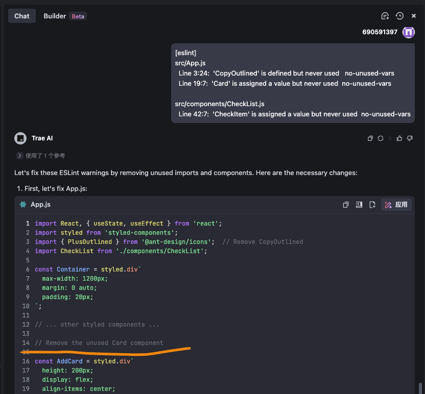 这里部署的时候,出现了几个 ESLint 报错,复制给 Trae 进行修复。代码标识的注释也给出了修复内容,但是没有生效。