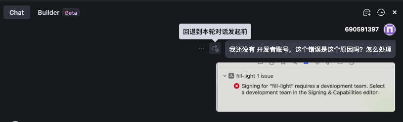 得到初步的代码回复,运行之后报错,内容直接从终端“添加到对话”,给出了修改方案(报错信息在终端关闭之后被清理,按道理也是属于对话内容,也可以作为对话调试的内容被保留的,可能是终端涉及了本地用户信息不做保留?)。